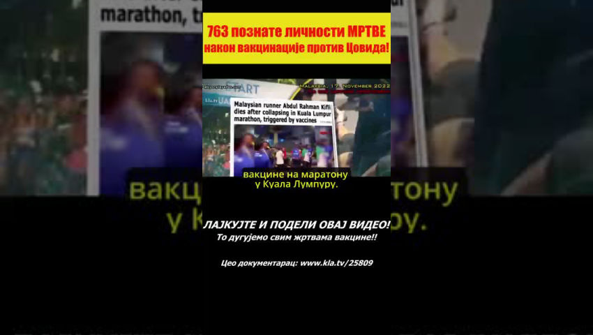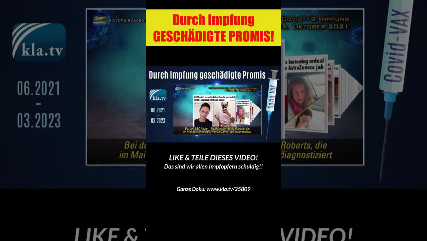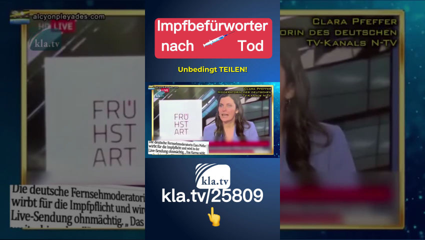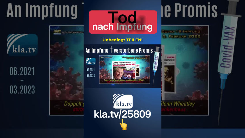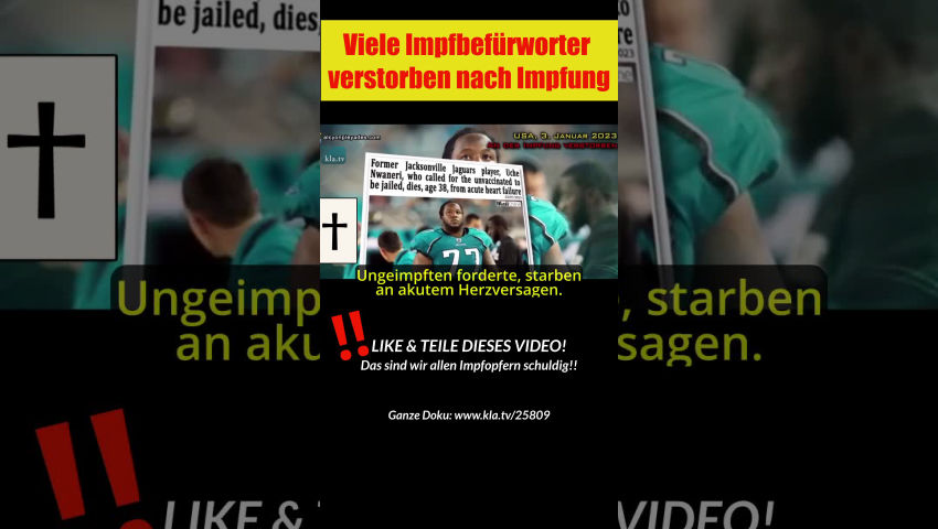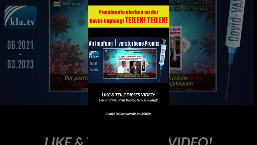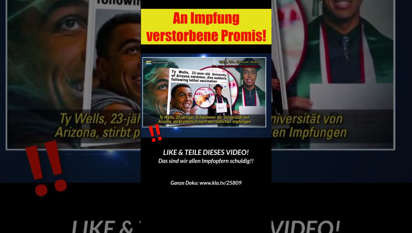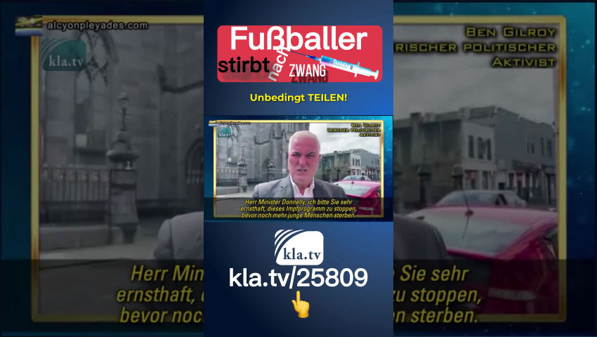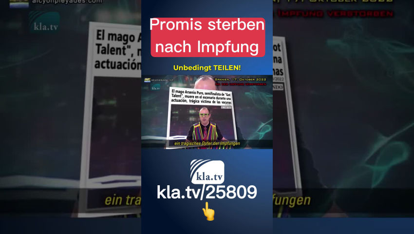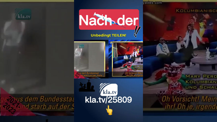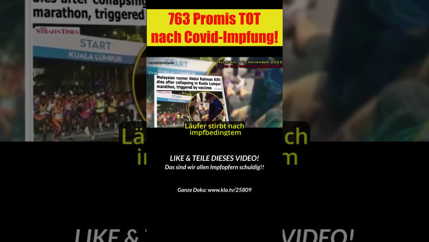 Komikerin: „Ich möchte, dass Sie wissen, dass ich doppelt geimpft bin und geboostert! Ich bin gereist, ich war zweimal in Mexiko, ich war auf Ausstellungen, traf und begrüßte Leute und bin nie an Covid erkrankt – natürlich! Jesus liebt mich über alles! Wirklich. So schön, so schön …!“ 21-jähriger Fußballspieler stirbt auf dem Spielfeld. Ein weiteres Opfer der mörderischen mRNA-Impfung. 22-jähriger Kabaddi-Spieler stirbt während eines Spiels an einem Herzinfarkt. Ein weiteres Opfer der toxischen Impfungen. 24-jähriger Sportler stirbt plötzlich, nachdem er aufgrund der Impfungen während eines Spiels zusammenbrach. Junger Kickboxer bricht nach der Gen-Impfung im Ring zusammen und stirbt. 20-jährige Tänzerin stirbt auf der Bühne an einem Herzinfarkt, ein weiteres tragisches Impfopfer. 20-jähriger Eishockeyspieler stirbt während eines Turniers an den Impfnebenwirkungen. Eishockeyspieler stirbt mitten in einem Spiel an einem impfbedingten Herzstillstand. 20-Jähriger Fußballer bricht auf dem Spielfeld zusammen und stirbt an den tödlichen Impfnebenwirkungen. Tänzer bricht auf der Bühne zusammen und stirbt aufgrund der tödlichen Impfung. Sportler stirbt an „Herzstillstand“ bei einem Radrennen, nach den Impfungen. 32-jähriger Marathonläufer stirbt an impfbedingtem Herzinfarkt kurz vor der Ziellinie. Magier stirbt auf der Bühne während eines Auftritts, ein tragisches Opfer der Impfungen. Radiomoderator stirbt live auf Sendung an einem Herzinfarkt, eine typische Auswirkung der Impfung. Trainer stirbt während einer Trainingseinheit an einem Herzinfarkt, verursacht durch die Impfungen. Läufer stirbt nach impfbedingtem Zusammenbruch beim Kuala Lumpur Marathon. Fußballer stirbt auf dem Spielfeld an einem Herzinfarkt, wie viele andere Sportler nach der Impfung. Handballspieler stirbt, nachdem er einen impfbedingten Herzstillstand mitten im Spiel erlitt und einen weiteren im Krankenhaus. 22-jähriger Mittelfeldspieler stirbt an einem Herzinfarkt, nachdem er im Training zusammengebrochen ist. Ein weiterer plötzlicher Tod eines gesunden Sportlers nach der Impfung. US-Enthüllungs-Journalist Stew Peters: „Und alles nach der Injektion einer Biowaffe, von der wir mit absoluter Sicherheit wissen, dass sie Myokarditis und andere Herzprobleme bei gesunden jungen Menschen, die sie erhalten, verursacht! Lassen Sie nicht zu, dass die Medien Sie zweifeln und glauben lassen, es sei normal und üblich, dass Sportler tot umfallen. Das ist es nicht und war es auch nie, zumindest bis vor ein paar Jahren.“ Diese Bilder und Aufzeichnungen lügen nicht. Durch die Corona-Impfung verursachte Todesfälle und Impfschäden, deren weltweites Ausmaß von den Medien vertuscht wird. Opfer, die es laut den Versprechen und Aussagen zahlreicher Medien, führender Politiker und deren Experten nicht geben dürfte. Weltweit haben sie zur Corona-Impfung aufgerufen! Allerorts wurden Ungeimpfte ausgegrenzt und diskriminiert… Kla.TV liegen 17 Stunden Filmmaterial vor, das ein riesiges Impfverbrechen dokumentiert. Es macht umfängliche Covid-Impftodesfälle und Impfschäden von prominenten Persönlichkeiten weltweit sichtbar. Welche Dimension verbirgt sich hinter den vertuschten Todesfällen und Impfschäden auf die Bevölkerung hochgerechnet? Denn diese umfängliche Dokumentation listet gerade nur einen Teil jener Fälle auf. Hier mussten die Medien berichten – da es sich um prominente Persönlichkeiten handelt! Jeder Versuch, die unzähligen Corona-Impftoten und Impfgeschädigten bisweilen nur schon in den Ansätzen vor der Bevölkerung aufzuzeigen, zog sogleich eine Verunglimpfung und Verachtung durch die Mainstream-Medien mit sich. Eines dieser Medien-Opfer ist der Initiator der „Galerie des Grauens“, Peter Ganz. Seine Ausstellung mit über 3.500 persönlichen Leidensschicksalen in Zusammenhang mit der Corona-Impfung wurde öffentlich in zahlreichen Städten von Deutschland aufgestellt. Diese war den Verfechtern der Corona-Politik und den Impfbetreibern offensichtlich ein Dorn im Auge. Die Folge: Diese umfängliche Dokumentation wurde in Hausdurchsuchungen größtenteils beschlagnahmt. Weltweit dokumentierten neben Peter Ganz zahlreiche freie Medien, Virologen, Epidemiologen, Plattformen und wahrheitsliebende Initiativen zahlreiche Todesfälle und enorme Impfschäden, die kurz nach dem Start der Corona-Impfung auftraten. Damit wollten sie die ahnungslose Bevölkerung vor den Gefahren und den Folgen der Impfung warnen. Stellvertretend dafür nur ein paar solcher Warnrufe: [!] Frankreich, Dezember 2022: Zahlreiche aufgereihte Fotos von Covid-Impftoten, zumeist junge Menschen, ließen in verschiedenen französischen Städten die Menschen erstarren! [!] Deutschland, Januar 2023: Eine Feldbettenaktion vor dem Deutschen Bundestag soll der Bevölkerung und Politik den enormen Schaden der Covid-Impfung vor Augen führen. [!] Warnruf aus Israel: Verzweifelte israelische Bürger dokumentierten vor laufender Kamera, wie sie nach der Corona-Impfung an schwersten Nebenwirkungen und Todesfällen in ihrem Umfeld leiden. [!] April 2021: Die Kla.TV-Doku „Dringender Weckruf: Tausende sterben nach Corona-Impfung“ dokumentierte die höchst alarmierenden Zahlen von Todesfällen unmittelbar nach Impfstart in deutschen Altenheimen. [!] Weltweit bezeugen umfängliche Datenbanken das Schicksal von unzähligen Spitzen-Sportlern, die unmittelbar nach der Impfung plötzlich kollabierten, oft sogar starben. Kla.TV hat in über 100 Sendungen aufs Dringlichste vor eben dieser Entwicklung gewarnt. Zahlreiche Experten, Fachkräfte und Virologen haben rechtzeitig die enorme Gefahr und die unabsehbaren Folgen in Zusammenhang mit der experimentellen Impftechnologie aufgezeigt. Solche Warnungen und verzweifelte Rufe wurden von den Mainstream-Medien verschwiegen, aufs Äußerste diffamiert und zensiert. Freie Medien, die die geschädigte Bevölkerung zu Wort kommen ließen, wurden sogleich von den Mainstream-Medien a