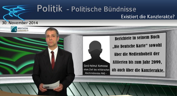 Hallo und herzlich willkommen bei Medien-Klagemauer TV aus unserem Studio Karlsruhe. Existiert eigentlich die Kanzlerakte? Man mag das Papier nennen wie man will, ob man es Kanzlerakte, Unterwerfungsbrief oder auch geheimer Staatsvertrag nennt, spielt keine Rolle. Wer die Existenz eines solchen Papiers leugnet, muss gleichzeitig Persönlichkeiten wie Egon Bahr und Gerd-Helmut Komossa als Lügner bezeichnen. Der ehemalige Chef des militärischen Abschirmdienstes "MAD*, Gerd-Helmut Komossa, berichtete in seinem Buch „Die deutsche Karte“ sowohl über die Medienhoheit der Alliierten bis zum Jahr 2099 als auch über die Kanzlerakte, die jeder Bundeskanzler vor Ablegung des Amtseides zu unterschreiben hatte, dies um die Vorbehaltsrechte der Alliierten zu bestätigen. Gleiches berichtet der ehemalige Staatssekretär im Bundeskanzleramt, Egon Bahr, über Willy Brandt, der sich zunächst weigerte, den Unterwerfungsbrief zu unterschreiben, um es letztendlich doch zu tun, genau wie seine Vorgänger Adenauer, Erhard und Kiesinger. Wie bekannt sein dürfte, existieren die Alliierten Vorbehaltsrechte bis heute. Warum also sollte dieser, wie Egon Bahr sich ausdrückt, Unterwerfungsbrief nicht mehr existieren? Das Verhalten der politischen Akteure beweist eher die Existenz eines solchen Briefes. Der Chef der Linken, Gregor Gysi, spricht hier folgerichtig von „Duckmäusertum“ der Merkel-Regierung gegenüber den Vereinigten Staaten von Amerika. Recht hat er. Der Journalist, politischer Aktivist und Autor zahlreicher Bücher über die Außenpolitik Jürgen Elsässer konstatierte über die Souveränität Deutschlands: „Selbst etwa 70 Jahre nach Kriegsende befinden sich immer noch über 50.000 US-Soldaten, hunderte Panzer und zahlreiche US-Stützpunkte, einschließlich Atomwaffen auf deutschem Boden! Und die Bevölkerung trägt weiter fleißig die Besatzungskosten in Milliardenhöhe! Damit finanzieren deutsche Bürger auch die menschenfeindlichen Drohnenkriege der US-Regierung! Welche faktisch gesehen Hinrichtungen ohne gerichtliche Urteile von Richtern darstellen! Todesstrafe ohne Gerichtsverfahren und das von deutschem Boden aus!“