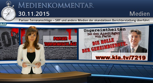 Nach den Pariser-Terroranschlägen vom 13. November fand in den Massenmedien eine regelrechte Hetzjagd nach den mutmaßlichen Attentätern und Drahtziehern statt. Über die Anschläge berichtete Klagemauer.tv in eingeblendeten Sendungen (www.kla.tv/7130, www.kla.tv/7138, www.kla.tv/7153; www.kla.tv/7190 ; www.kla.tv/7198).