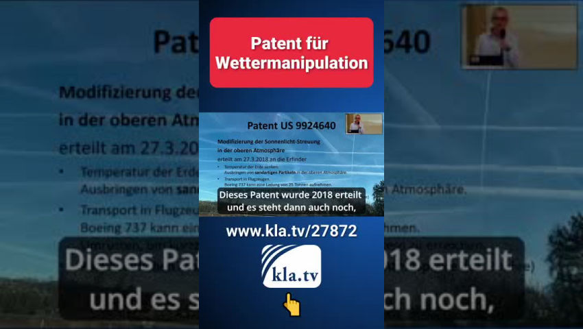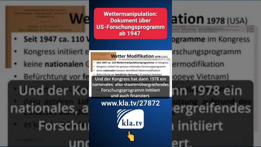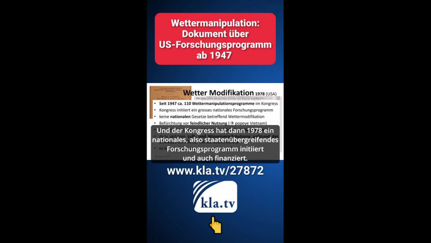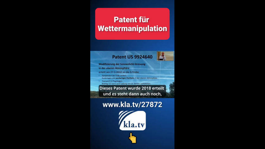 Das könnte Sie auch interessieren: „Klimakatastrophe“ durch künstliche Wettermanipulationen www.kla.tv/27386 Werner Altnickel: Chemtrails/HAARP www.kla.tv/24345 Wird das Wetter verrückt gespielt? www.kla.tv/23225 CO₂-Debatte als Ablenkung von Wettermanipulationen durch Militärs www.kla.tv/16286 |