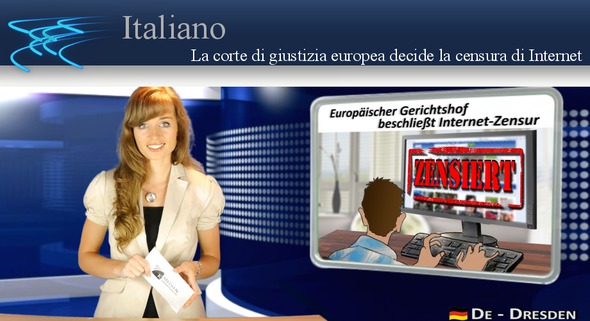 dai nostri media occidentali è stato menzionato piuttosto a margine che nel marzo 2014 la corte (di giustizia) europea decise la censura di internet. Vogliamo mostrarvi con questa trasmissione che conseguenze avrà in pratica, chi ci perde e chi ci guadagna.
