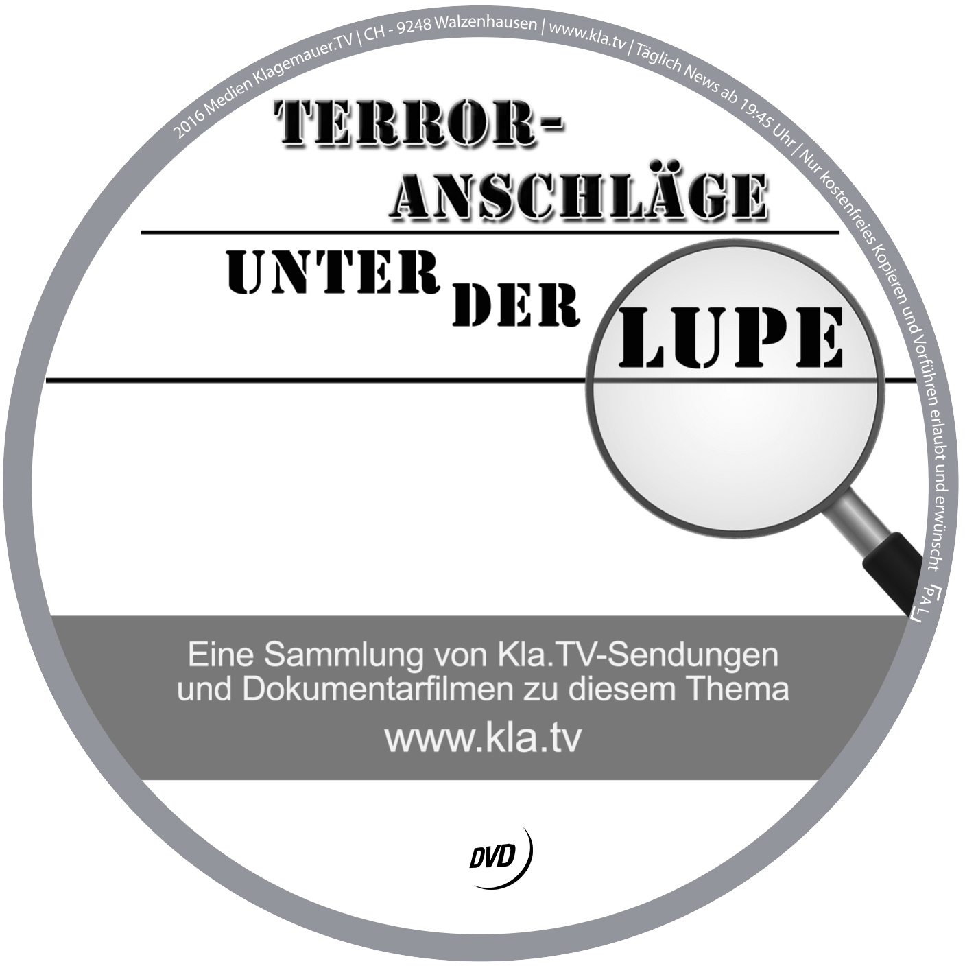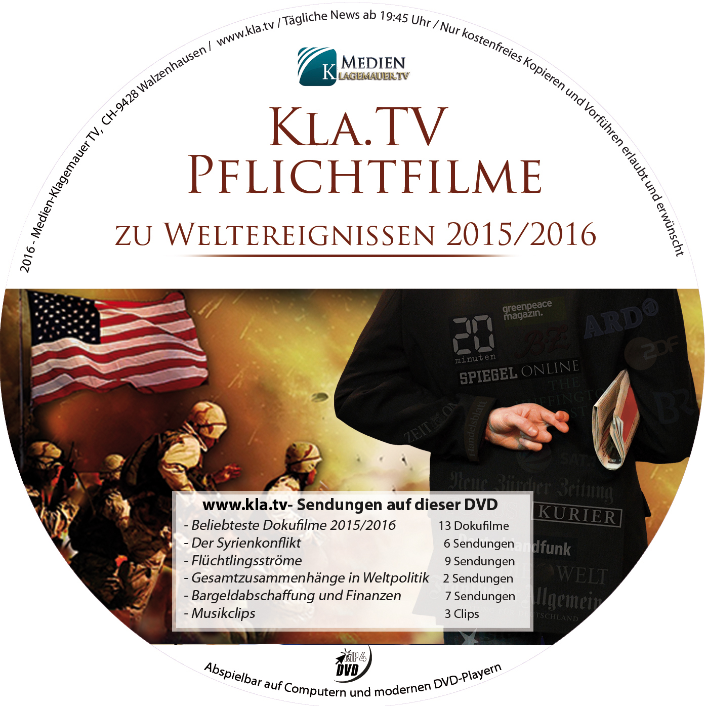 Werbe-DVDWichtige kla.tv Sendungen auf einer DVD zusammengefasst. Dateigrösse der DVD: 4.36 GB |
