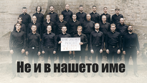 Не и в нашето име Не и в нашето име И в теб и в мен една и съща кръв тече, като синове и бащи стоимe ние тук, мирът и свободата са общо благо. Да, това е, за което живеем. Не за произход, раса или религия. Те, само сърцата ни разделят. Визията е за мир и свобода, за свят, в който си струва да се живее. А вие ни принуждавате да се убиваме жестоко. А ние всъщност, всичките сме братя. Ние казваме: Не и в нашето име! Няма, да воюваме във вашите войни! Няма, оръжия да носим, те, никога не водят до победа Ние казваме: Не и в нашето име! Няма, да воюваме във вашите войни, няма, оръжия да носим, те, не водят до победа. Колко още, това ще продължава? Подтик към алчност, власт и война? Чувате ли, жертвите се молят на небето ако не ние, тази лудост кой ще я спре? Който предизвиква страх, омраза и гняв в хората, той, подстрекава войната и е човекомразец. Той е този, който води всичко към разрушение, и отрича се всяка човечност. Ние казваме: Не и в нашето име! Няма, да воюваме във вашите войни, няма, оръжия да носим, защото те никога не водят до победа. Ние казваме: Не и в нашето име! Няма, да воюваме във вашите войни, няма, оръжия да носим, защото те никога не водят до победа. От сестрите, и братята си крадете предатели такива, как не ви е срам, водите на кланица, невинни хора и казвате, че, е морално. Нациите ви, се съгласяват с нас. Никой, власт няма да ви дава, чужда кръв ви лепне по ръцете, ще ви преследва, докато сте живи! Ние казваме: Не и в нашето име! Няма, да воюваме във вашите войни, няма, оръжия да носим, защото те никога не водят до победа. Ние казваме: Не и в нашето име! Не си изкарвайте, гнева на нас, само подхранвате, още повече омраза. Ние не сме, дяволски създания! Ние казваме: Не и в нашето име! Не злоупотребявайте с нас заради алчността си вие сами ще понесете, щетите от това защото скоро вие ще сте на мерника! За тази песен, са се събрали мъже от Южна Германия, за да се противопоставят на войната.