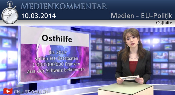 Liebe Zuschauerinnen und Zuschauer auf Klagemauer.TV, herzlich begrüßen wir sie zu unserer Serie zu "JA ur Einwanderungsinitiative - Steht die Schweiz nun auf verlorenem Posten? So zumindest beurteilen die Medien die Situation nach dem Ja ein. Doch, wie z.B. unser heutiges Thema "Osthilfe" zeigt, ist es eher umgekehrt. „Bis 2017 sollen EU-Oststaaten eine Milliarde Franken aus der Schweiz bekommen, um den wirtschaftlichen Aufbau voranzubringen. Die Schweizer Behörden haben nach dem Abstimmungs-Ja zu dieser sogenannten Kohäsionsmilliarde, weitere 257 Millionen Franken an die neuen EU-Länder Bulgarien und Rumänien zugesagt. Als Kohäsionsmilliarde bezeichnet man den „Erweiterungsbetrag“, welchen die Schweiz im Jahre 2004 beschlossen hat, jedem der zehn neuen Staaten zukommen zu lassen, die am 1. Mai 2004 der Europäischen Union beigetreten sind. Der Bundesrat hat der EU zudem angeboten, zusätzliche 45 Millionen Franken für Aufbauhilfe in Kroatien zu leisten. Die EU wünscht aber von der Schweiz noch mehr Geld für ihren Ostaufbau. Steigt die Schweiz nicht darauf ein oder stoppt sie gar die laufenden Zahlungen, falls die EU gewisse Verträge kündigt, trifft das vor allem die Empfänger in den Oststaaten. Denn entgegen den Versprechungen des Bundesrates profitieren Schweizer Unternehmer kaum von den Aufträgen, die die Empfänger mit dem Geld finanzieren. Bis Mitte 2012 gingen lediglich Aufträge in der Höhe von 23.5 Millionen Franken an hiesige Firmen – ein Klacks im Vergleich zur Milliardenzahlung. Sie sehen, werte Zuschauerinnen und Zuschauer, wer von wem profitiert und wer Interesse daran haben sollte, dass die Beziehungen zwischen der Schweiz und der EU aufrecht erhalten bleiben! Falls sie interessiert sind, noch mehr zu den Folgen der zurückliegenden Abstimmung zu erfahren, so schauen sie sich die anderen Sendungen zum Themenblock vom Datum? an. Mit diesen Gedanken verabschieden wir uns und wünschen Ihnen einen schönen Abend.