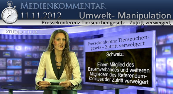 Klagemauer.TV hier im Studio Chur, guten Abend verehrte Zuschauer Warum eine Zutrittsverweigerung bei einer Pressekonferenz zum Tierseuchengesetz? An der Pressekonferenz des Schweizerischen Bauernverbandes zur Abstimmung über das revidierte Tierseuchengesetz, wurde einem Bauern, er ist Mitglied des Bauernverbandes, und auch weiteren Mitgliedern des Referendum-Komitees der Zutritt verweigert. Der Bauer zeigte seine Einladung vor, die sich jedermann über das Internet ausdrucken konnte und bestand auf Einlass. Nach einigem Hin und Her wurde ihnen die Tür geöffnet. Doch nach wenigen Schritten erschien sogleich ein zweiter Bodyguard des Bauernverbandes mit dem Kommentar:„ Ihr seit hier nicht erwünscht.“ Nur durch Beharrlichkeit und letztlich unter der Bedingung keine Fragen zu stellen, wurde dem Bauern und seinen Begleitern dennoch Einlass gewährt. Weshalb dürfen bei einer Pressekonferenz des Pro-Tierseuchengesetzkomitees keine Fragen gestellt werden? Etwa, weil überzeugende Antworten fehlen und dies nicht bekannt werden soll? Ist auch der Bauernverband nicht daran interessiert die Bedenken seiner Mitglieder zu hören und dazu Stellung zu nehmen? Nur allein schon aufgrund dieses undemokratischen Verhaltens gehört bei einer Abstimmung am 25.11. ein klares Nein in die Urne. Wir empfehlen Ihnen als Ergänzung zu diesem heutigen Medienkommentar auch denjenigen vom 28.10.2012. Hiermit kommen wir zum Ende unserer Sendung. Ich verabschiede mich und wünsche Ihnen einen schönen Abend.
