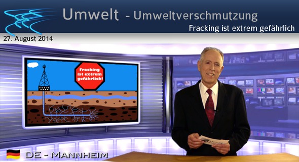 Sehr verehrte Damen und Herren,ich begrüße Sie recht herzlich zur heutigen Sendung von Kla-TV aus dem Studio Mannheim.Heute möchten wir sie mit einen Verfahren bekannt machen, das Mensch und Umwelt gleichermaßen bedroht: Dem Fracking.Beim Fracking werden Wasser und Chemikalien bis zu 2500 m in die Tiefe gepumpt, um Erdgas aus dem Gestein zu gewinnen. Seit 2005 ist es deshalb Öl- und Gasfirmen in den USA erlaubt, giftige Stoffe in Trinkwasserbestände oder deren Nähe einzubringen, wobei der Mindestabstand der Förderungsstätten zu Wohngebieten nur 200 m beträgt. Die chemische Giftbrühe, die beim Fracking zurückbleibt, muss nicht entsorgt werden, sondern man lässt sie verdunsten oder ins Grundwasser sickern. Anwohner berichten von körperlichen Beschwerden, Gasgeruch und dunklem Wasser aus dem Wasserhahn, welches aufgrund des hohen Methangehaltes entzündbar ist. Auch in der BRD wird schon gefrackt, bisher weitgehend unbemerkt.Verehrte Zuschauer, geht hier wieder ein Mal mehr der Profit über die Gesundheit der Bürger und den Umweltschutz? Oder wieso werden solche Methoden wie das Fracking angewandt, ohne dass die Bevölkerung ausreichend darüber informiert ist?Es gilt wachsam zu sein und rechtzeitig sein Umfeld auf solch extrem gefährliche Verfahren wie das Fracking aufmerksam zu machen.Also, sprechen sie darüber und behalten sie es nicht für sich! Denn mündige Bürger brauchen wir, die helfen wenig Gehörtes vom Volk für das Volk zu verbreiten. Wir wünschen ihnen noch einen angenehmen Abend. Auf Wiedersehen.