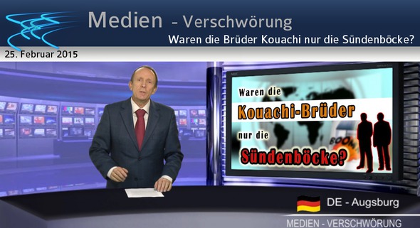 Guten Abend im Studio Augsburg – heute noch einmal zum Anschlag auf Charlie- Hebdo in Paris Waren die Brüder Kouachi nur die Sündenböcke? In der Berichterstattung der Mainstream-Medien über den Terroranschlag auf „Charlie Hebdo“ fanden sich keine Hinweise zu Zeugenaussagen, die den offiziell geschilderten Ablauf des Anschlags hinterfragten! Warum ist das so? Es gab durchaus gegensätzliche Aussagen. So beschrieb zum Beispiel ein Zeuge die beiden Täter als „groß und schwarz“. Doch laut dem „gefundenen“ Ausweis ist Saïd Kouachi 1,69 Meter klein, sein Bruder Chérif sei nach Aussagen von Nachbarn ebenfalls klein. Eine weitere Zeugin ist die Journalistin, die das Attentat auf die „Charlie Hebdo“ Redaktion erlebt hatte. Sie berichtete, dass einer der Angreifer, der sie durch die Maske anschaute, blaue Augen hatte. Wenn man aber die Fahndungsfotos der Brüder Kouachi studiert, hat keiner blaue Augen. So stellt sich die Frage: Waren sie überhaupt die Attentäter oder wurde ihnen der Anschlag nur in die Schuhe geschoben, um die tatsächlichen Attentäter zu schützen? Wäre es nicht die Aufgabe einer sogenannt freien Presse, über die offensichtlichen Ungereimtheiten zu berichten, Fragen aufzuwerfen und Aufklärung zu fordern? Wir bei Kla.TV haben bereits am 10. Januar ausführlicher darüber berichtet. Sie finden die Medienkommentare „Terror-Anschlag auf „Charlie Hebdo“ Teil 1 bis 3, unter der Rubrik „Terror“. Verbreiten Sie diese weiter und helfen Sie so mit, die Gegendarstellung bekannt zu machen! Vielen Dank und auf Wiedersehen!